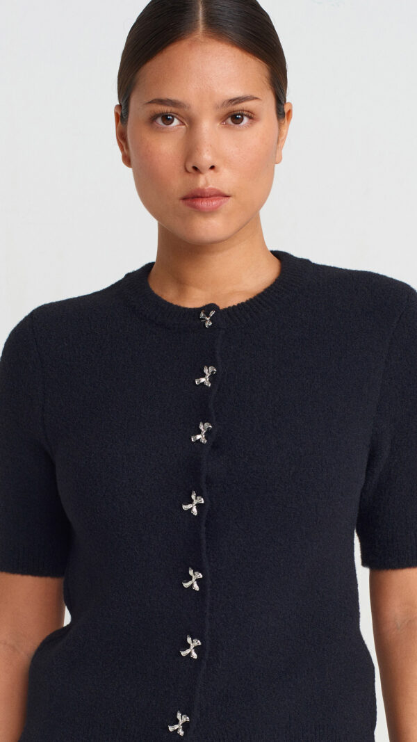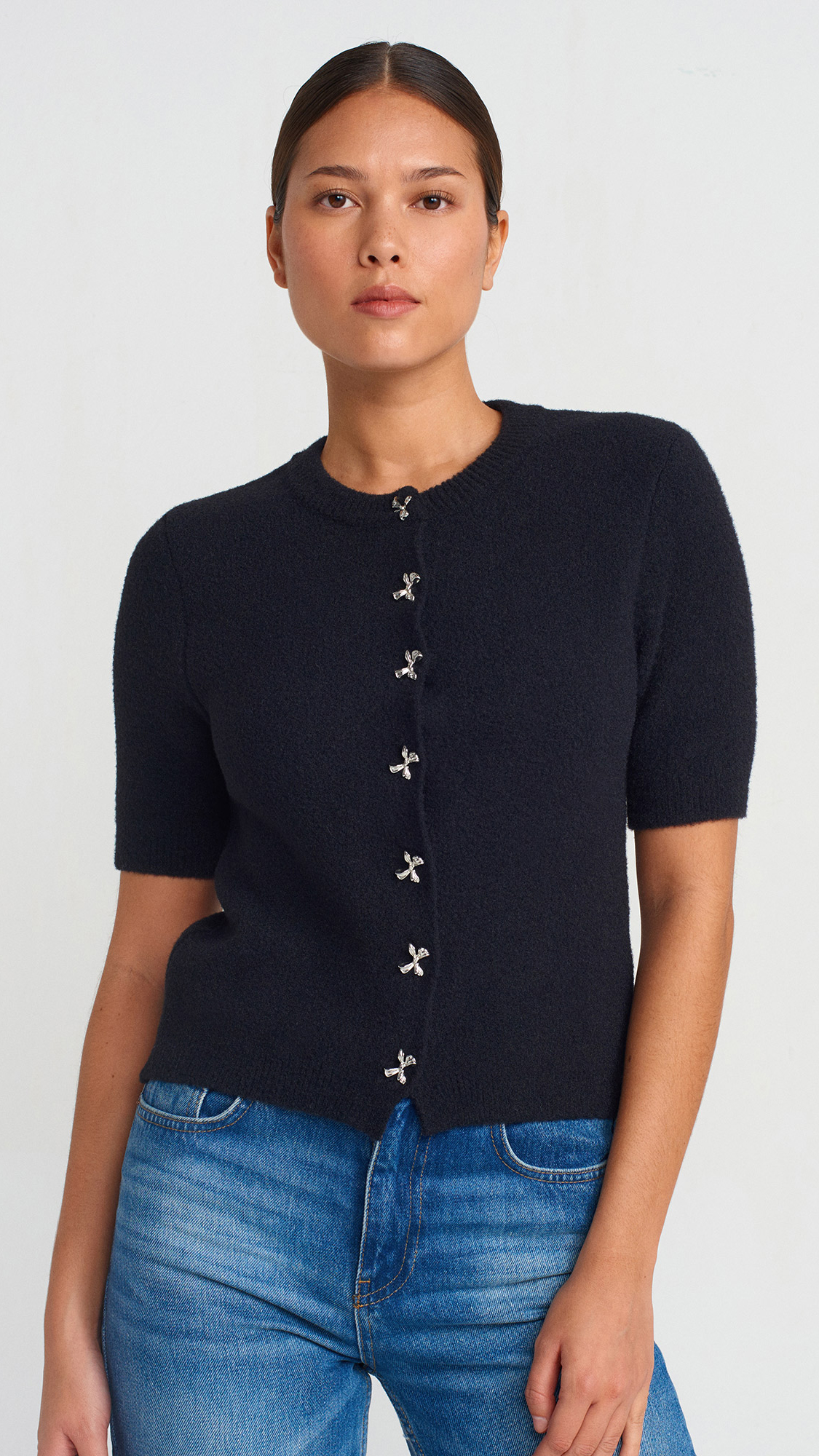 Crew Neck Soft Textured Buttoned Knit Cardigan-Black